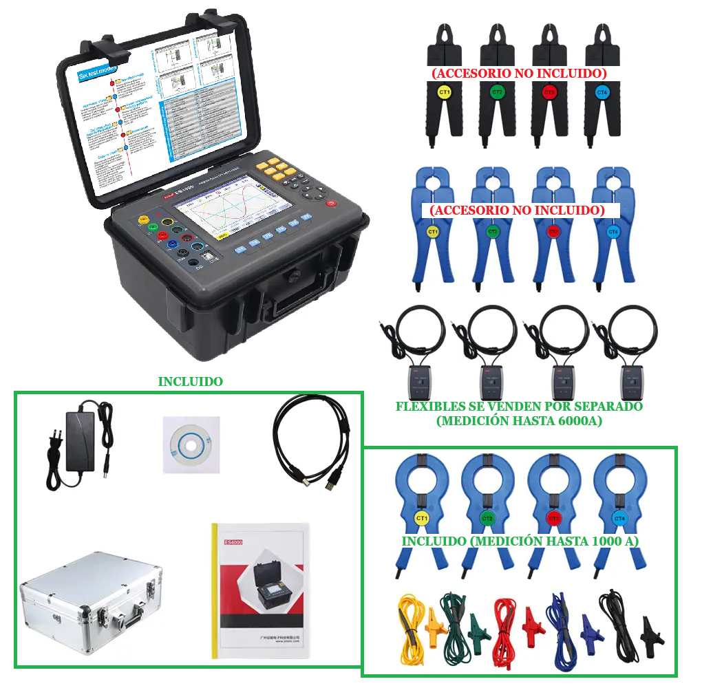 - Corriente: Puede medir corrientes desde 10mA hasta 6000A (dependiendo el accesorio), con capacidades para medir en baja y alta corriente, incluyendo múltiples sensores de corriente para una cobertura completa.