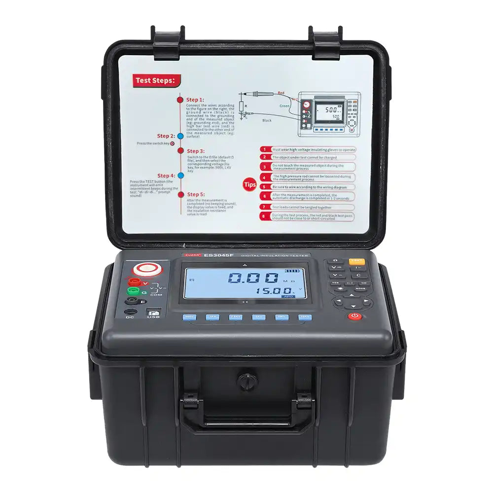 El Fuzrr ES3045E es un probador digital de resistencia a aislamiento ideal para aplicaciones industriales y de mantenimiento. Con una medición de alta precisión en un rango de hasta 35TΩ, permite realizar pruebas de aislamiento con voltajes de hasta 10kV. Su interfaz LCD fácil de leer y la capacidad de almacenar hasta 500 conjuntos de datos hacen que este dispositivo sea altamente eficiente. Además, cuenta con opciones de medición de corriente, capacitancia y resistencia, y puede conectarse a una computadora mediante USB para un análisis más detallado.